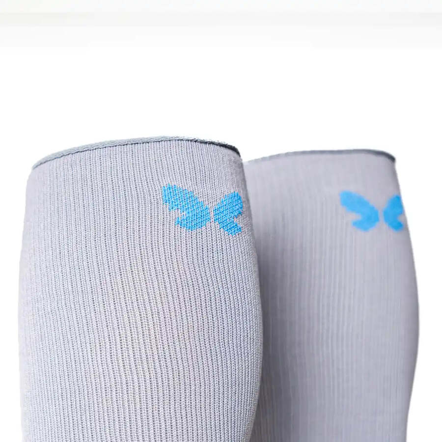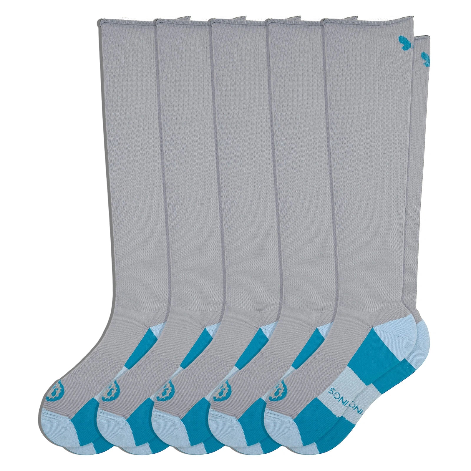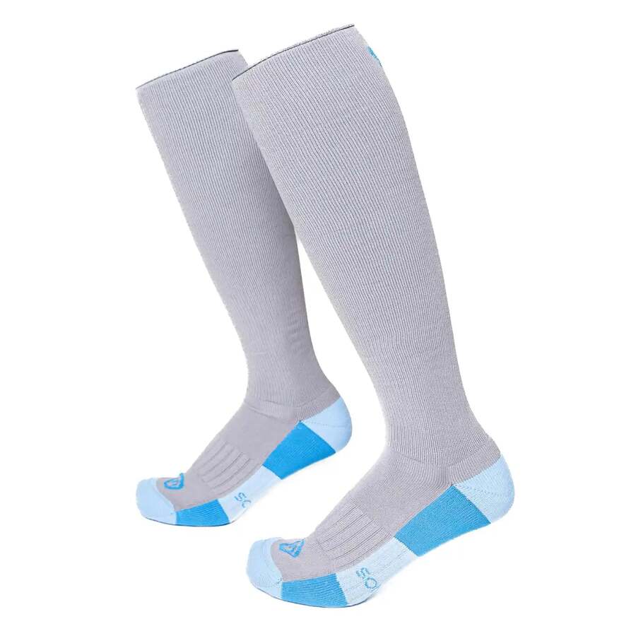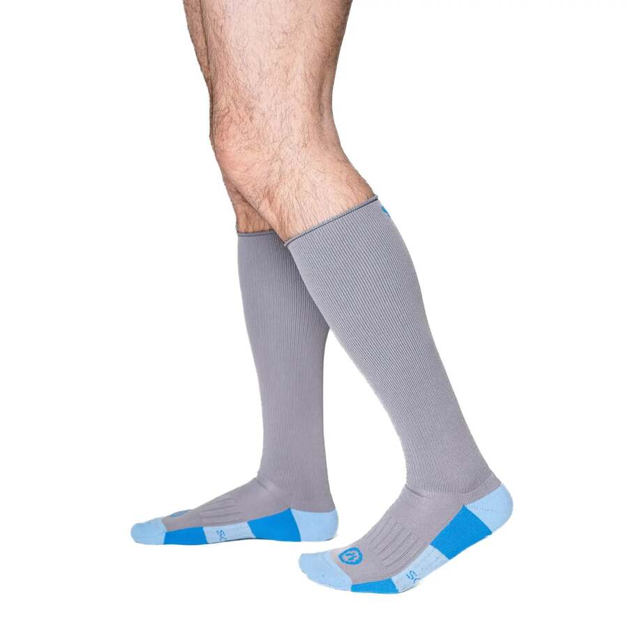 Mega Pack de 5 pares de calcetines compresivos (14-17 mmHg) fabricados en poliamida, color gris y azul, altura por debajo de la rodilla. Suela reforzada, especialmente pensado para hacer deporte o para personas que necesitan calzado especial o de seguridad para trabajar.
