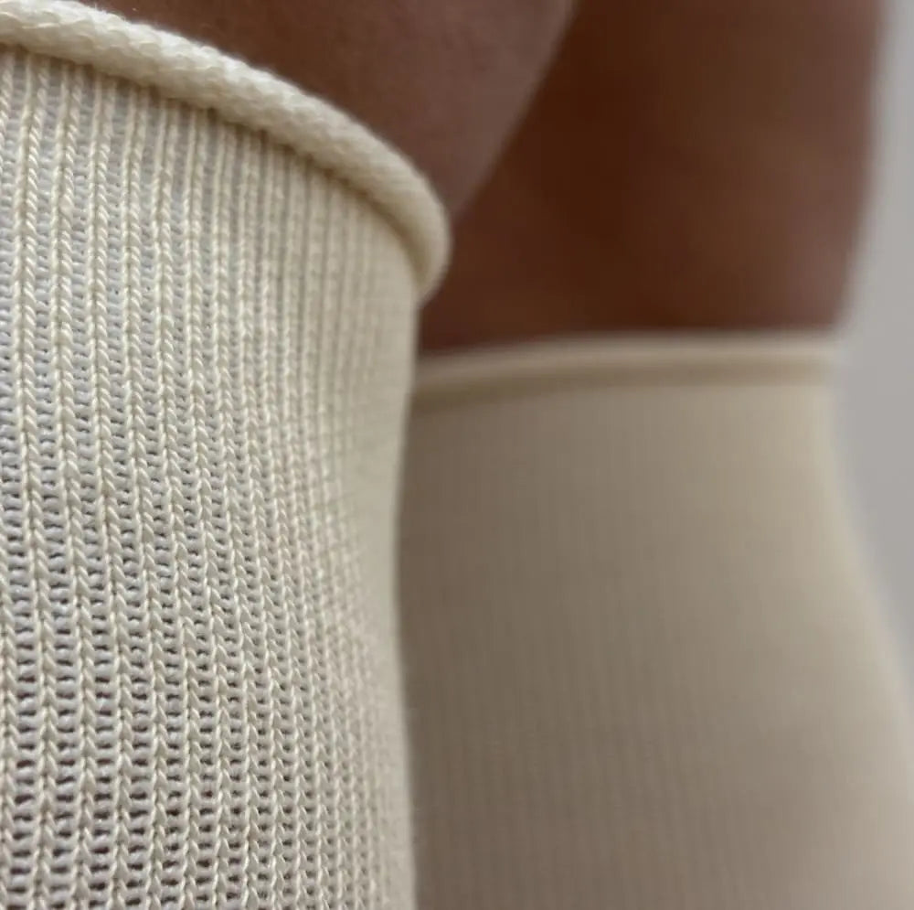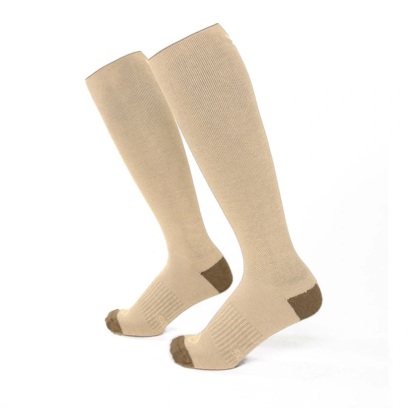 Calcetines compresivos (14-17 mmHg) fabricado en algodón, color beige y marrón claro, altura por debajo de la rodilla. En Calcetinos ponemos la tecnología a tus pies: